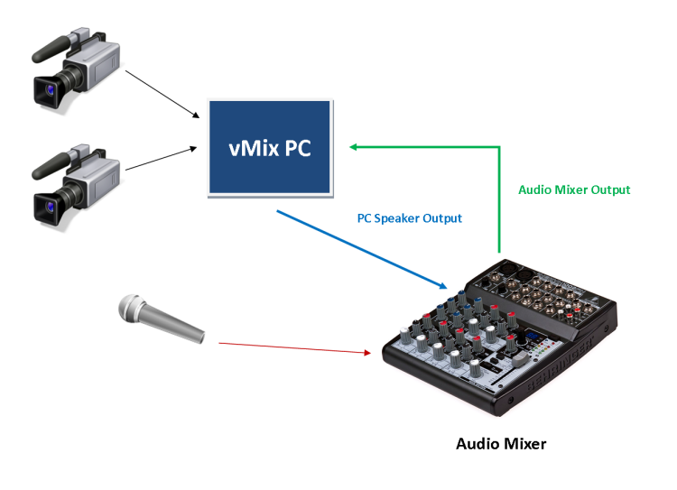 In the diagram above, all external audio sources such as Microphones are connected to a separate external Audio Mixer.