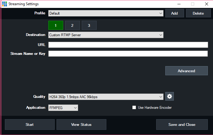 Select the encoding profile to use for the stream. A number of built in presets are included or you can click the cog icon to customise these.
