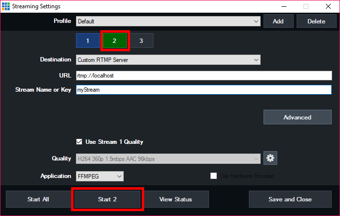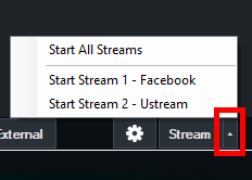 Streams can also be controlled from the Streaming Settings window by selecting the top stream button to select the stream, then the Start x / Stop x button at the bottom of the window.