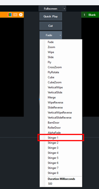 In the main window, select Stinger 1 as one of the four transition buttons in the middle of the screen.