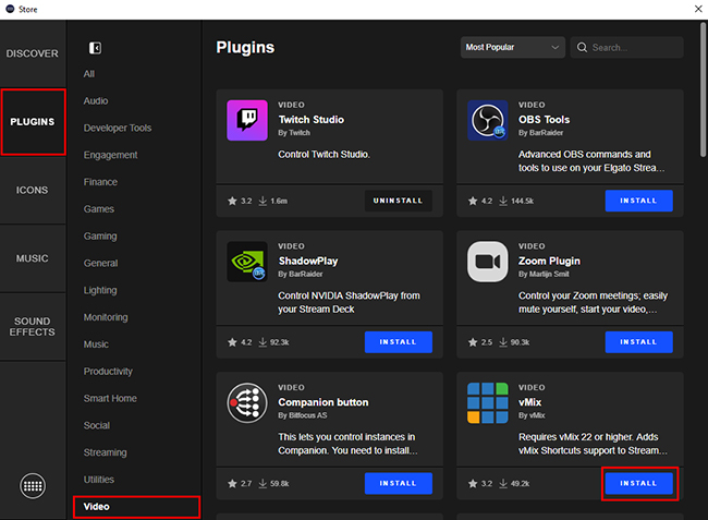Click Plugins in the left sidebar. Then select the Video category and scroll down to vMix. Alternatively, use the search field in the top right corner to filter the vMix plugin. Once located click the Install button.