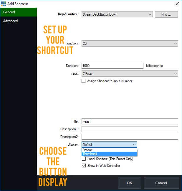 Then set up your shortcut. You can also choose what displays on the button. If you'd like a preview of the vMix input that the shortcut is linked to then select Thumbnail.