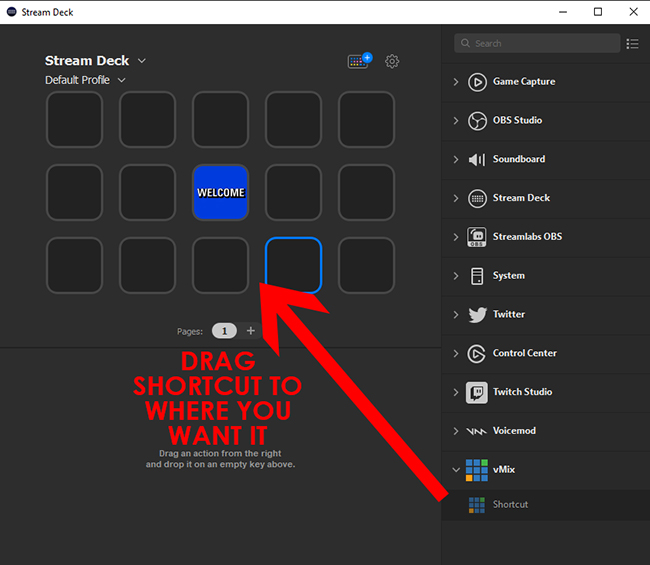 After you have added the vMix app, just select the vMix shortcut button and drag it to all of the buttons you want to assign a vMix shortcut to.