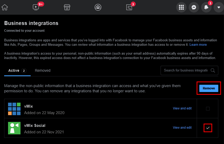Under the Active tab click the checkbox next to the vMix Social item (with the green icon) then click the Remove button.