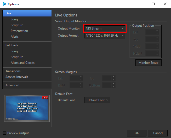 From the Live section, go to Output Monitor and choose the option for NDI Stream. Select your preferred Output Format and press OK.