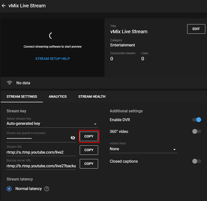 5. Next you will see some Stream Settings including a Stream Key. Click the Copy button to copy the Stream Key.