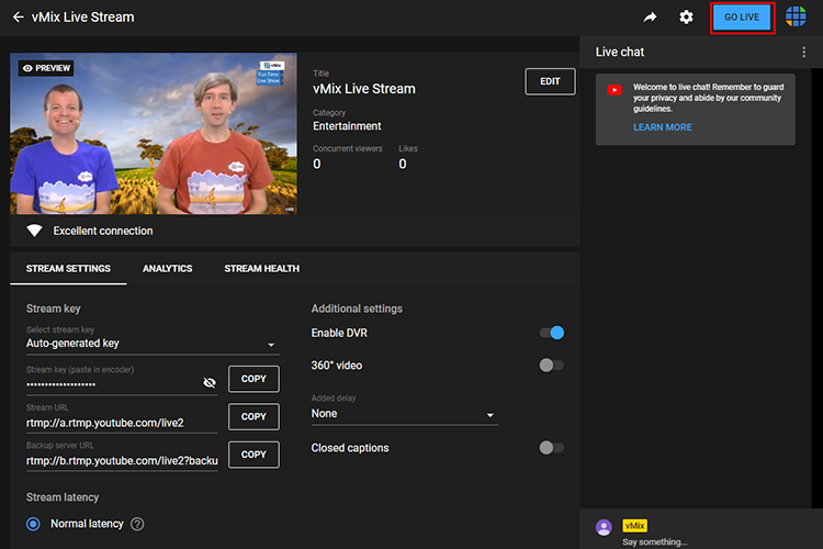 9. If you have scheduled the stream - go back to your web browser where you should now see the live stream preview showing. Click the Go Live button to go live.