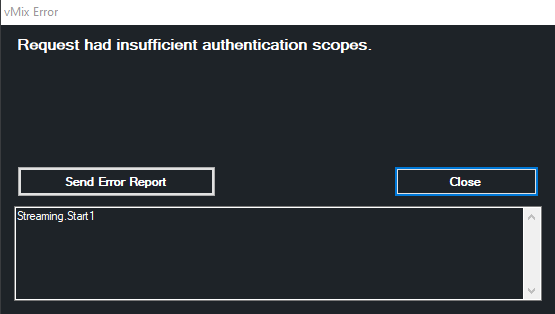 You may encounter the following error when attempting to login to YouTube from either the vMix stream settings window or vMix Social window: