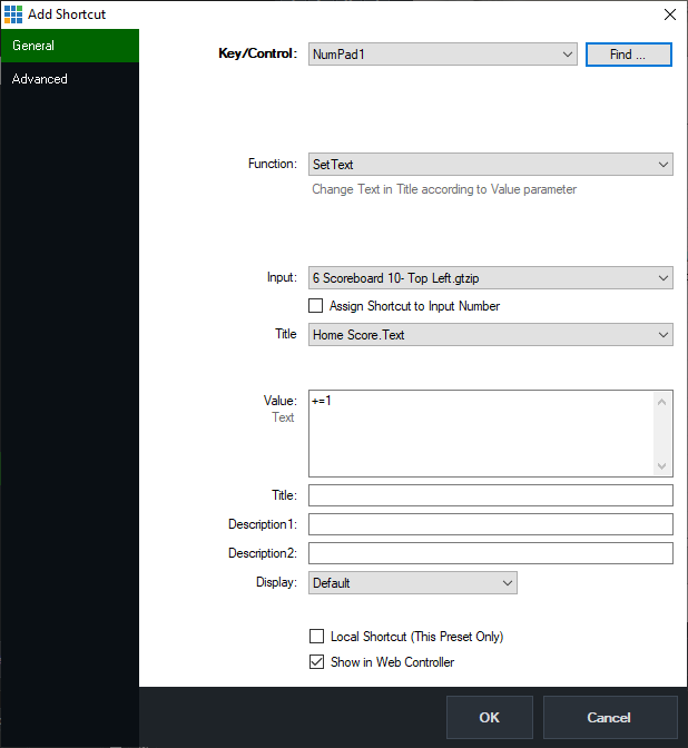 Below is an example of the shortcut setup using the 'number pad 1' key to increment the home-team score by 1 point: